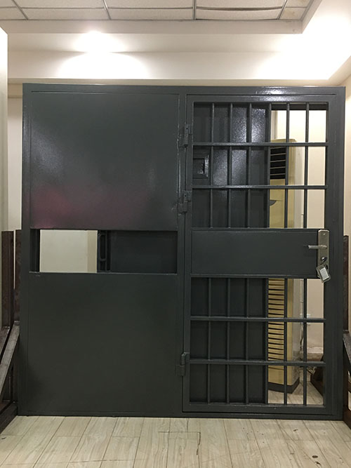 監(jiān)室門可向門洞兩側(cè)雙向開啟或左、右兩側(cè)單向開啟。監(jiān)室門主要由開門機組件、傳動件罩殼、傳動組件、導軌、行走輪、支架、導軌罩殼、門扇、控制箱、導向輪、密封組件等組成。導軌安裝于門洞上邊,門扇通過行走輪組件懸掛于導軌上,由開門機通過傳動組件帶動行走輪、門扇一起行走。傳動組件內(nèi)(或?qū)к壱粋?cè))設有限位開關(guān),門開啟和關(guān)閉到位后,即自動停止。導軌、傳動組件、開門機上均設有罩殼防塵、防雨,門扇下方設有導向輪和擋鐵,以限制門扇前后擺動。如遇停電或電路故障,可用專用鑰匙將開門機中離合器分離,即可實現(xiàn)手動啟閉。監(jiān)室門不僅堅固可靠,而且有很好的耐久性,采用的原材料,精密的工藝及制造技術(shù)。外表采用先進的粉末噴涂表面處理工藝,不僅堅固可靠,而且有很好的耐久性?? 1、集中遠程控制,按照指令實現(xiàn)單獨開門或關(guān)門,以及總開、總關(guān)所有門扇;????2、總線制布線,工程施工十分簡潔,布線成本。???? 3、采用一體化動力梁設計,免維護結(jié)構(gòu),不但在安裝施工中非常方便,而且在日后需要移裝時亦可簡單拆分后再次安裝使用。???? 4、門扇運行時遇阻能電動退回,具有防夾人的安全功能,實現(xiàn)人性化管理。??????5、門扇遇阻退回后能電動執(zhí)行再關(guān)門動作,直到把門關(guān)閉;累計遇阻3次即電動報警,防止蓄意破壞。???? 6、開啟門扇時能聯(lián)動各門口攝像頭,同步監(jiān)視現(xiàn)場情況;???? 7、關(guān)門到位電動實現(xiàn)馬達鎖定功能,并可聯(lián)動另加電鎖,實現(xiàn)雙鎖定的多重安全保障。???? 8、可設定在火警信號下實現(xiàn)手動開、關(guān)門功能,符合火災等緊急情況疏散要求。