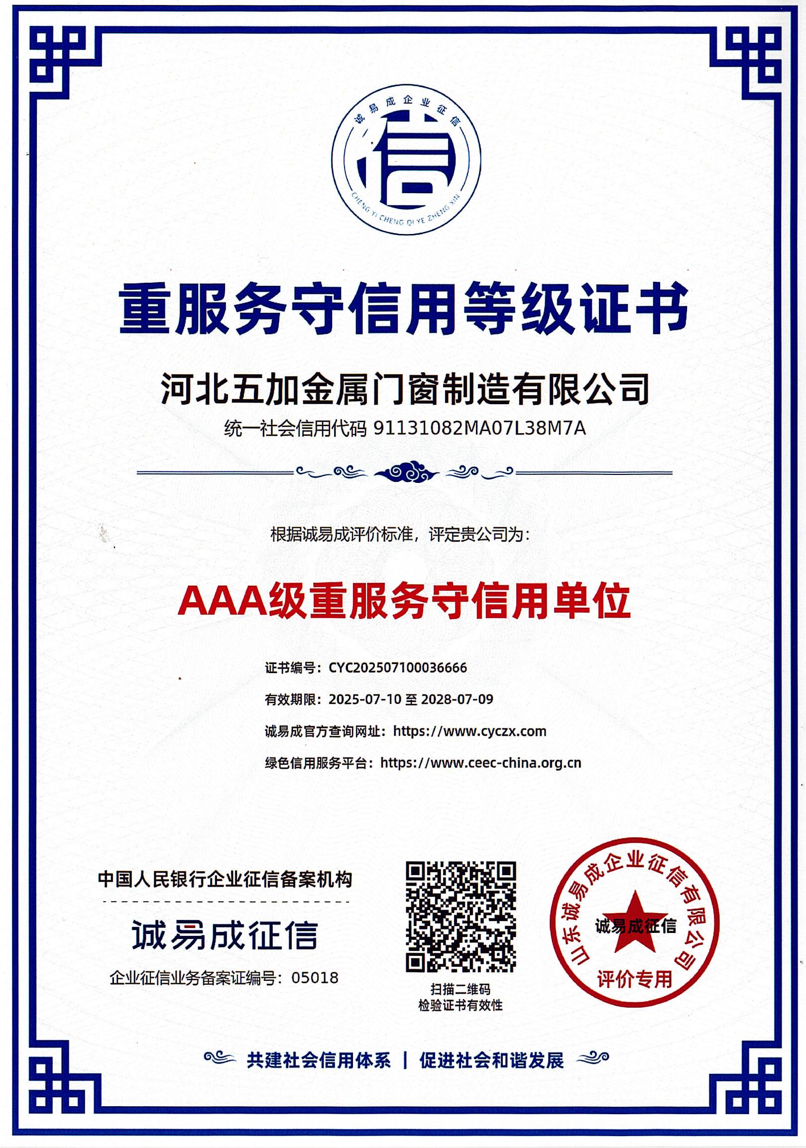 重服務(wù)守信用AAA級(jí)證書